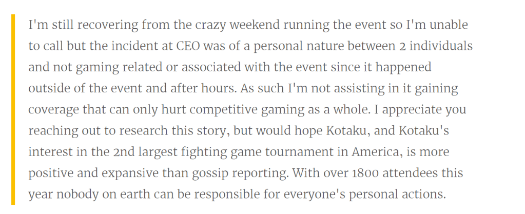 None of these were objective and harshly condemned the actions of both Bakhtanians and the Wednesday Night Fights’ commentary immediately following. The apotheosis of the divide was after writer Jason Schreier posted about Noel Brown’s arrest after a domestic incident at the Florida hotel where the CEO tournament was taking place. The organizer, Alex Jebailey, had this to say when asked for comment by Schreier: