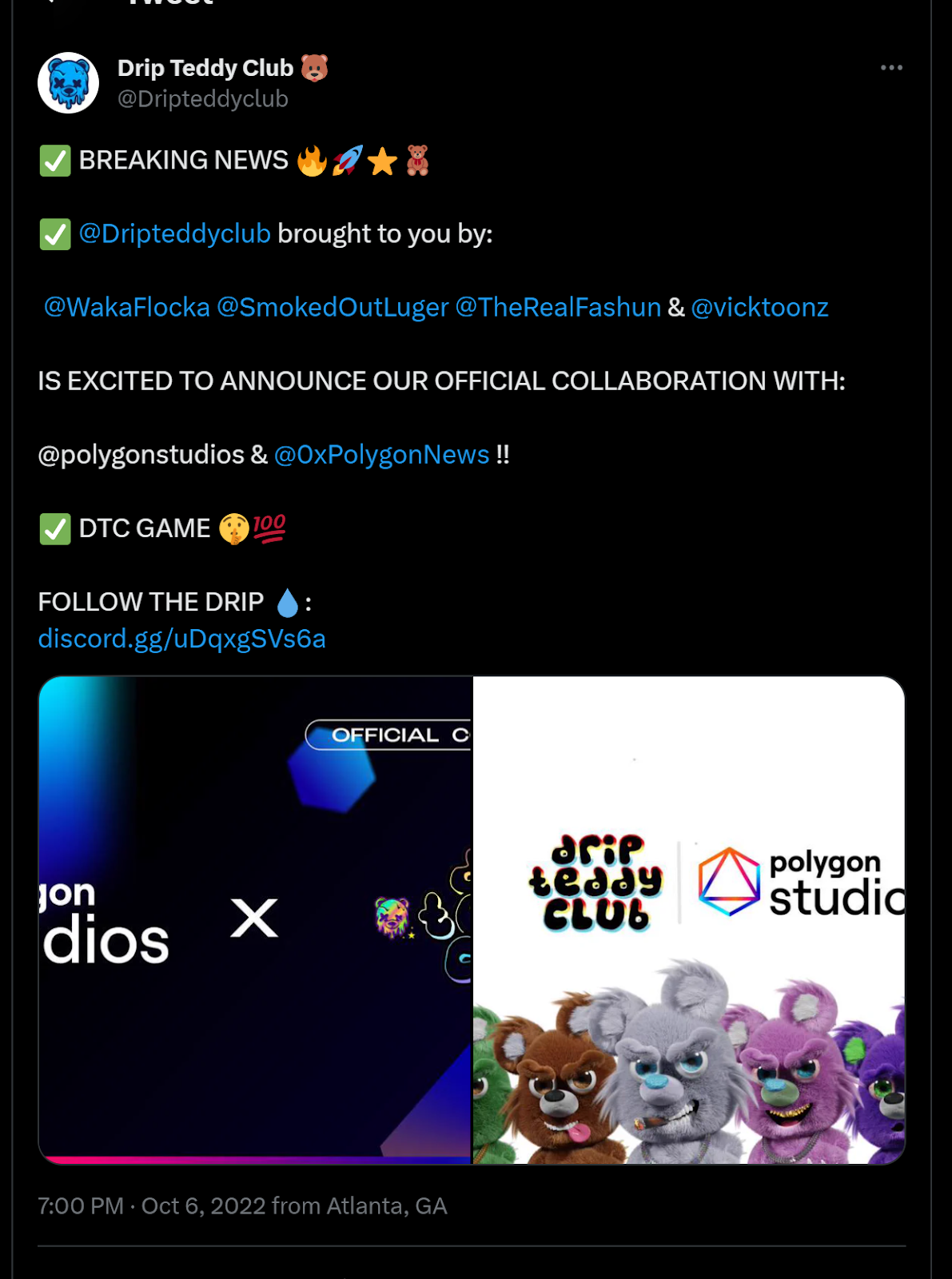 Yep, definitely all in! Apparently the crowning achievement of this endeavor is the Drip Teddy Club, an NFT collection of, well, static images featuring a Teddy Bear, ostensibly dripped out: